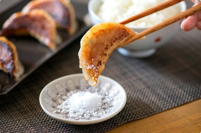 餃子といえばタレが一般的ですが、「もちもち えびす餃子」は「笹川流れの塩」で食べる餃子として開発しました。「笹川流れの塩」は、村上市にある海岸「笹川流れ」の清らかな海水で仕上げた天然塩。薪を使った昔ながらの方法でじっくりと煮詰めているため、えぐみのないまろやかな味わいが魅力です。シンプルな塩で食べるからこそ、小麦の風味が際立つのです!